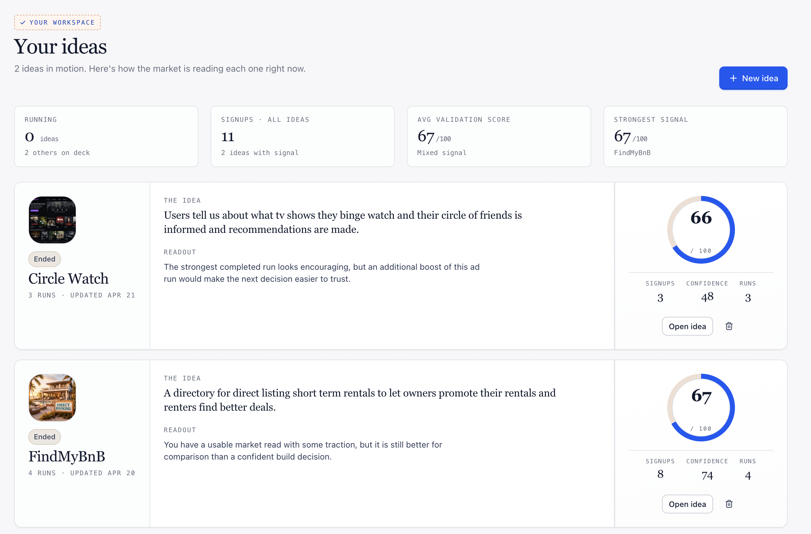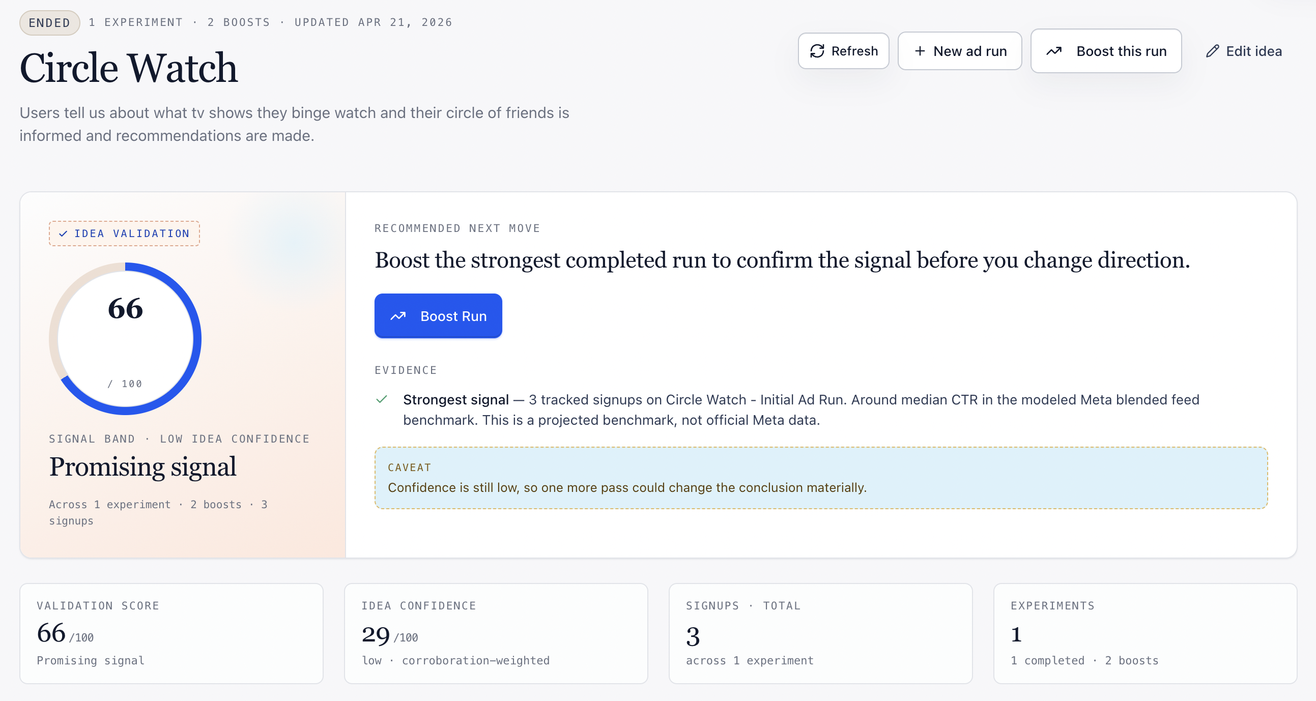 - You get a clean readout. In a few days, you get the metrics that actually matter — CTR, conversion rate, cost per signup — plus a plain-English recommendation on whether the signal is strong enough to keep building.